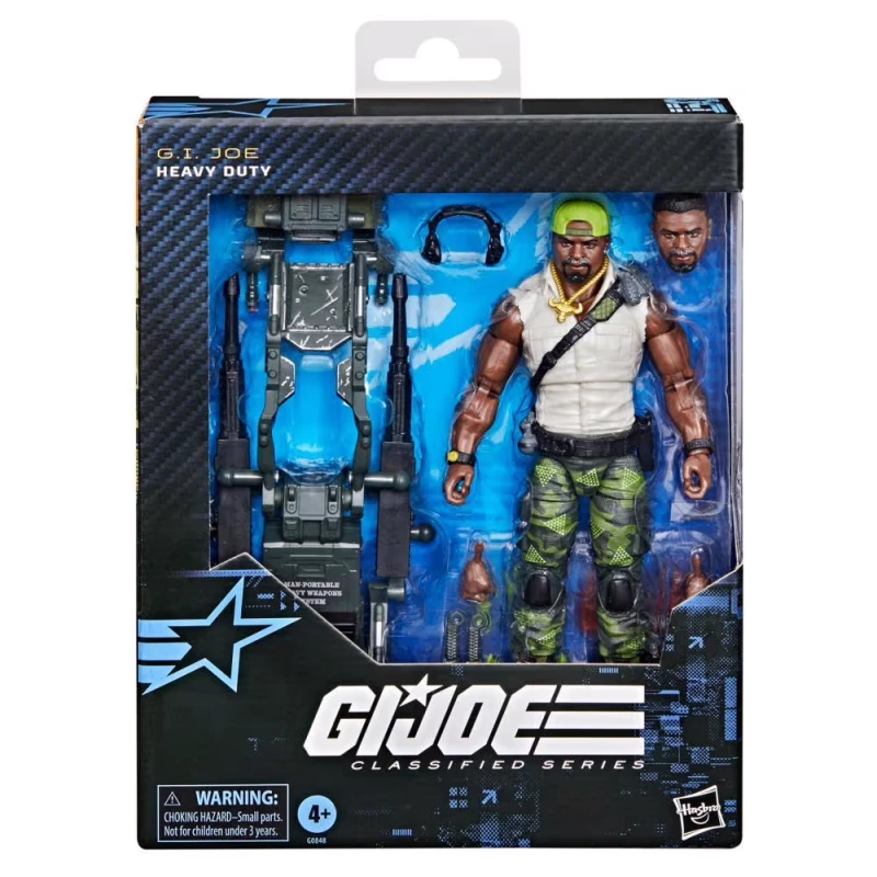 G.I. Joe is a highly skilled, on-demand, special operations force of men and women from around the globe tasked with defending the world from Cobra, a ruthless criminal organization bent on total domination. The brave members of G.I. Joe are prepared to seek out Cobra in any environment on the planet. From hostile jungles to ice-clad arctic peaks…wherever there’s trouble, G.I. Joe is there. New to the G.I. Joe Classified Series line, Heavy Duty comes ready for adventure, with multiple points of articulation for high poseability. This Heavy Duty Deluxe figure set is bursting with 30 character-inspired accessory pieces which attach to him and his Man-Portable Heavy Weapons System. Included are 2 detachable M202 Quad Burst missile launchers, 8 missiles, 8 blast effects, 2 laser cannons, ammo belt, 2 rotary cannons, 2 knives, an alt head, 2 alt hands, headphones, and range finder.